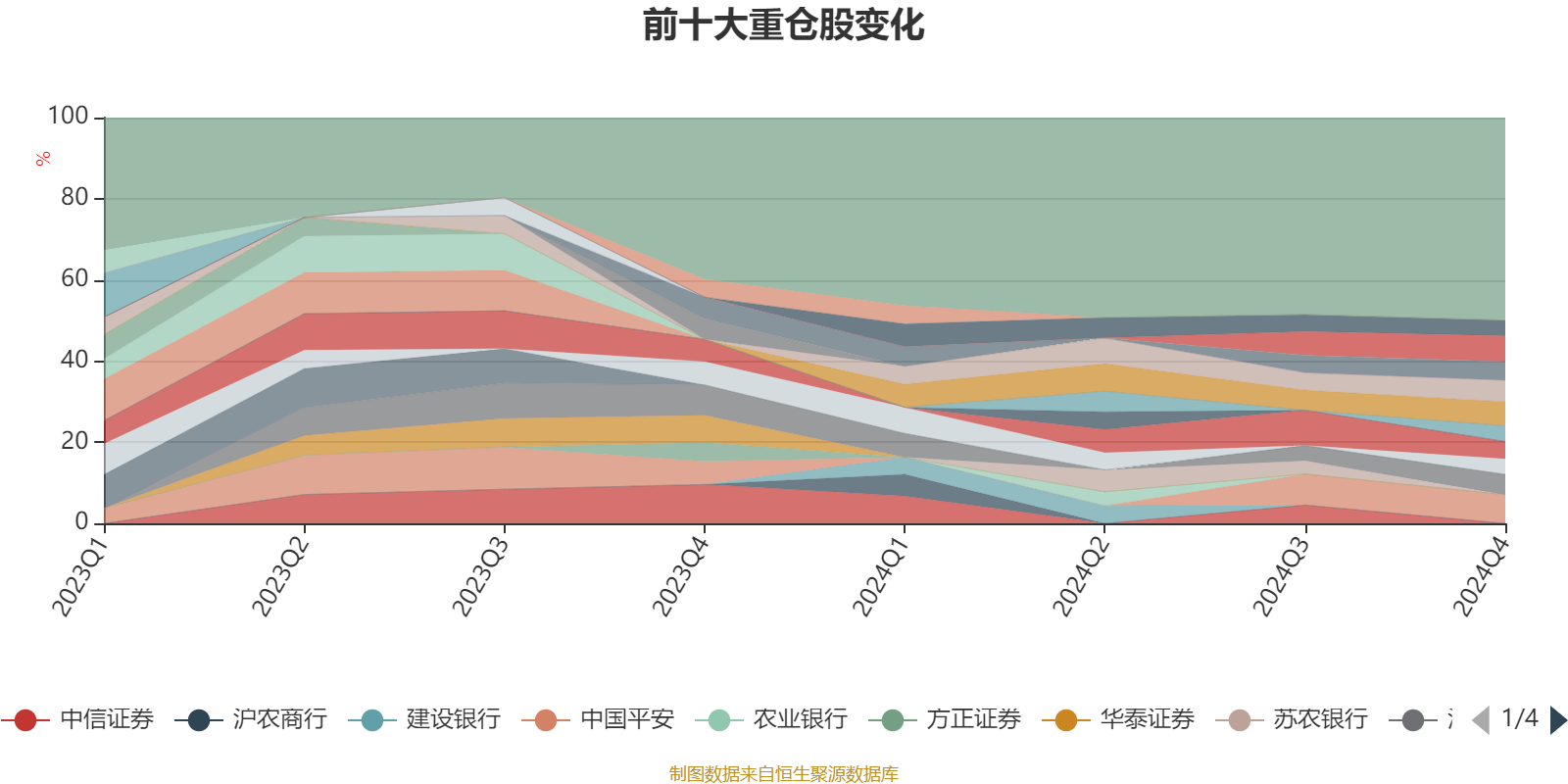 该基金持股集中度较高。截至2024年末,基金十大重仓股分别是中国平安、宁波银行、招商银行、成都银行、江苏银行、中国银河、中国太保、杭州银行、北京银行、常熟银行。